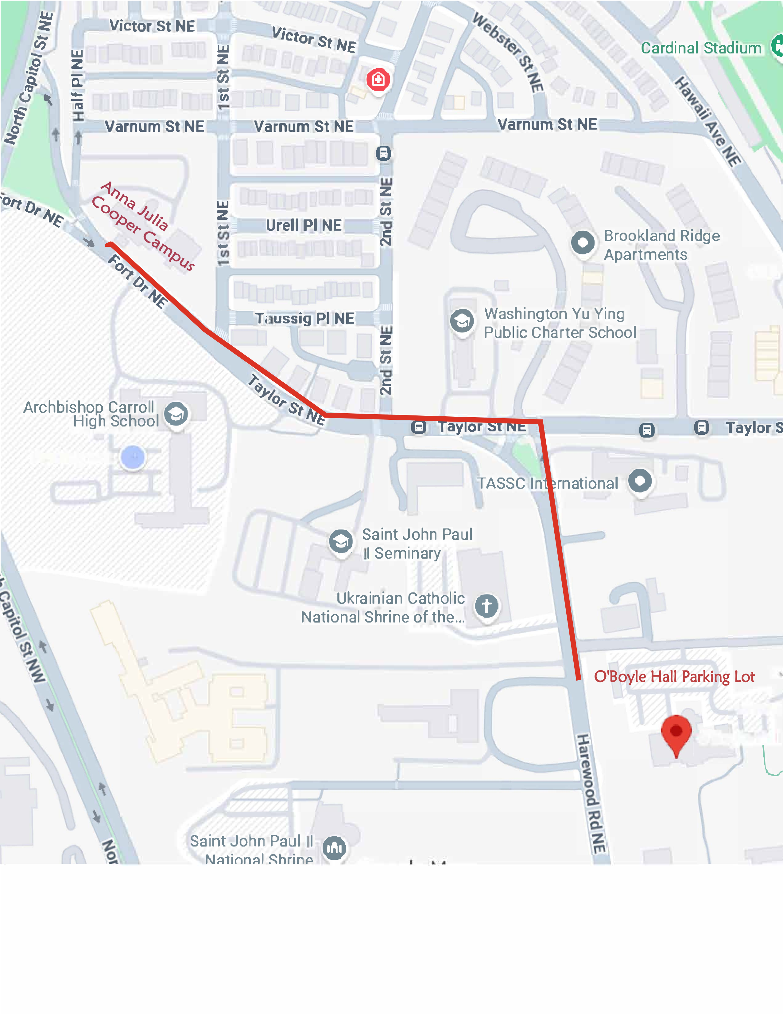 - Please note that there is no on-campus parking at the Cooper Campus, but we have secured spaces at the O’Boyle lot at Catholic University, a five-minute walk from campus (see this map).