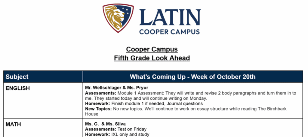 Check out this new way to see what is upcoming for each grade at the Cooper Campus. The Look Aheads are on google for students and families to see an overview of homework, tests, etc.